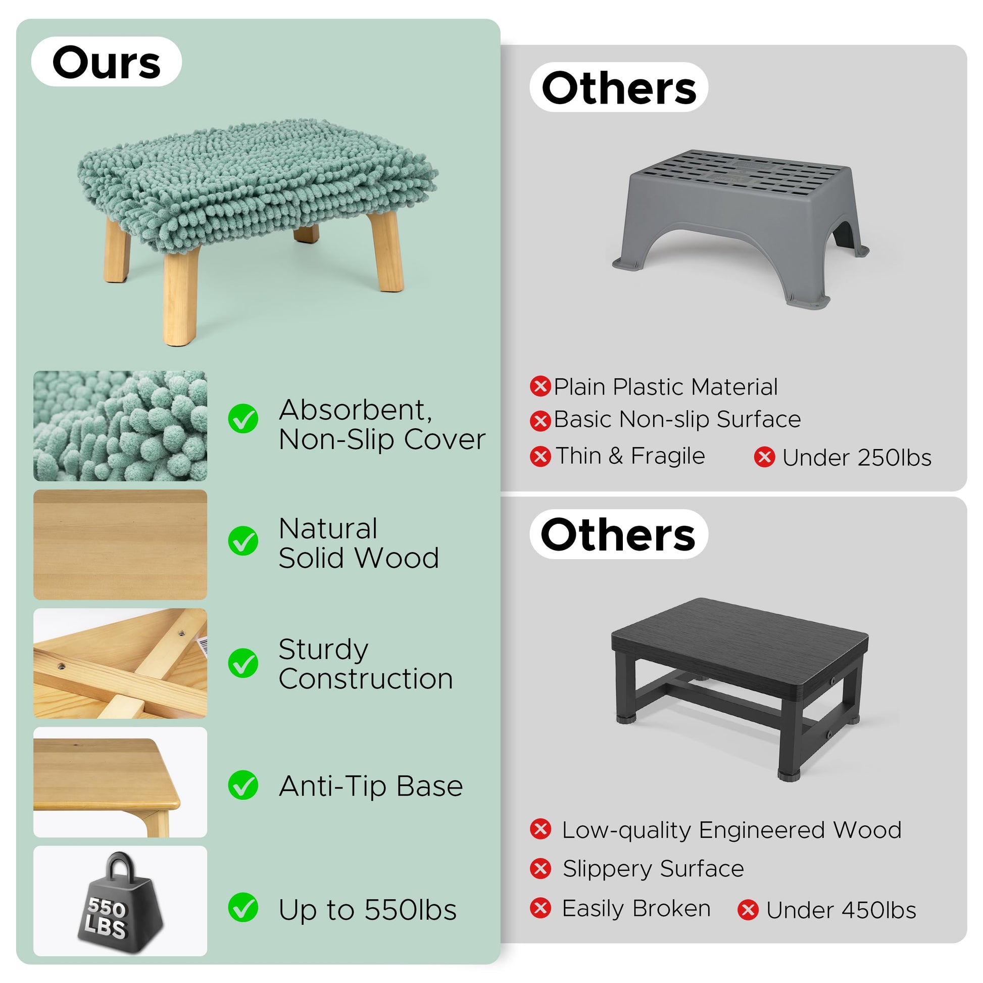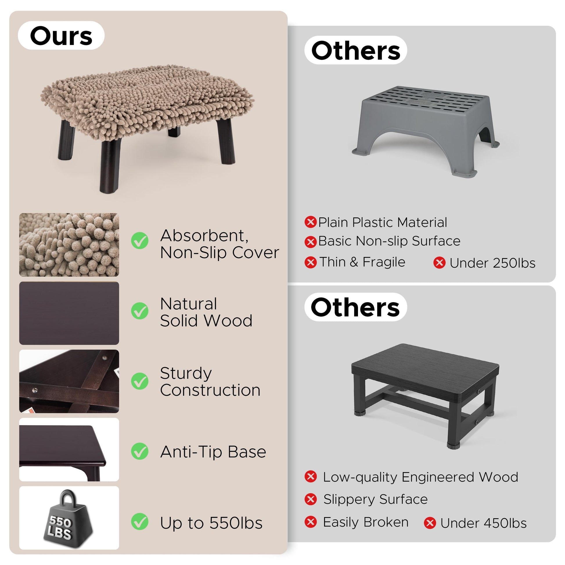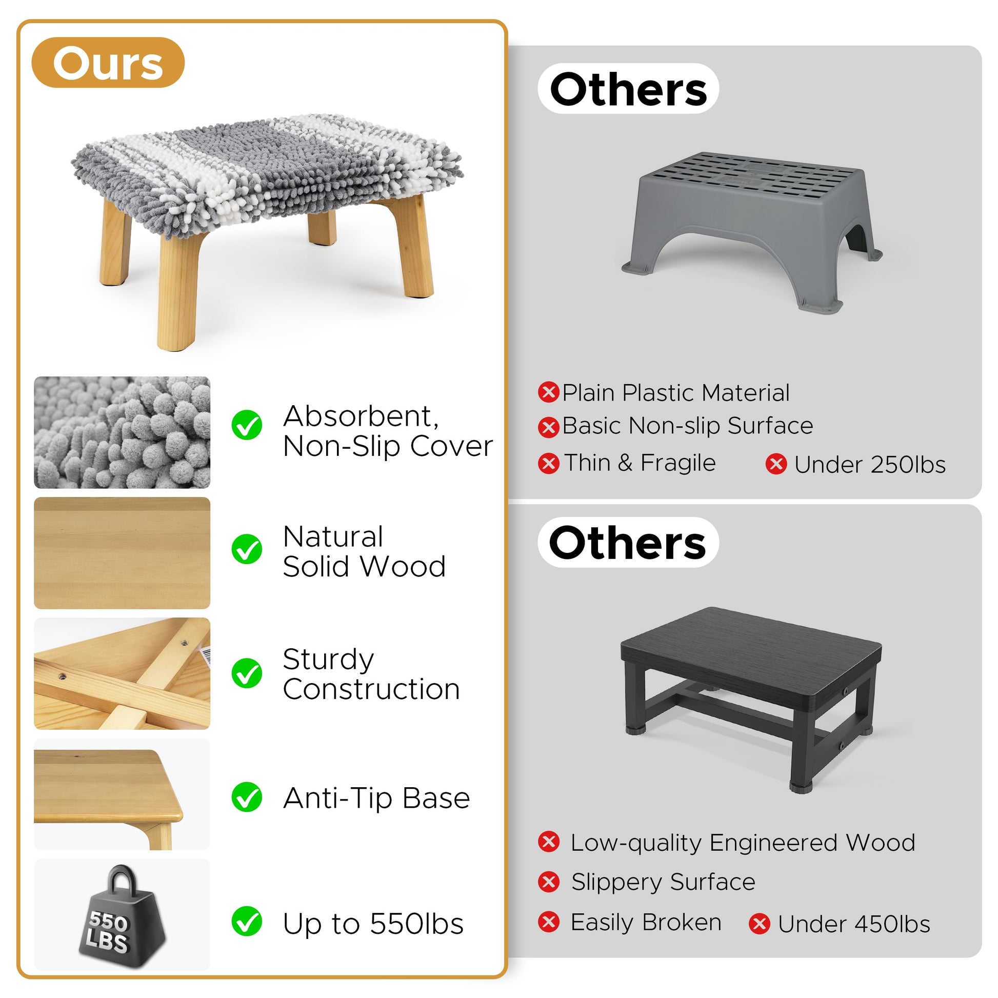 - [ High-Quality Materials ] The main part of 1 step stool is made of durable solid wood with a natural finish. The topper layer is a super absorbent bath mat that provides superior comfort.